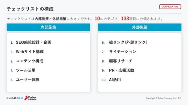 株式会社Faber Company(ファベルカンパニー/本社:東京都港区、代表取締役:稲次正樹・古澤暢央)は、15年以上のSEO支援の実績を活かし、WebサイトのSEO状況を簡単にチェックできる「ミエルカ式SEOチェックリスト」をアップデートしました。本チェックリストは、企業のマーケティング担当者やSEO担当者向けに提供しており、最新のSEOトレンドに対応した内容へとアップデートされています。