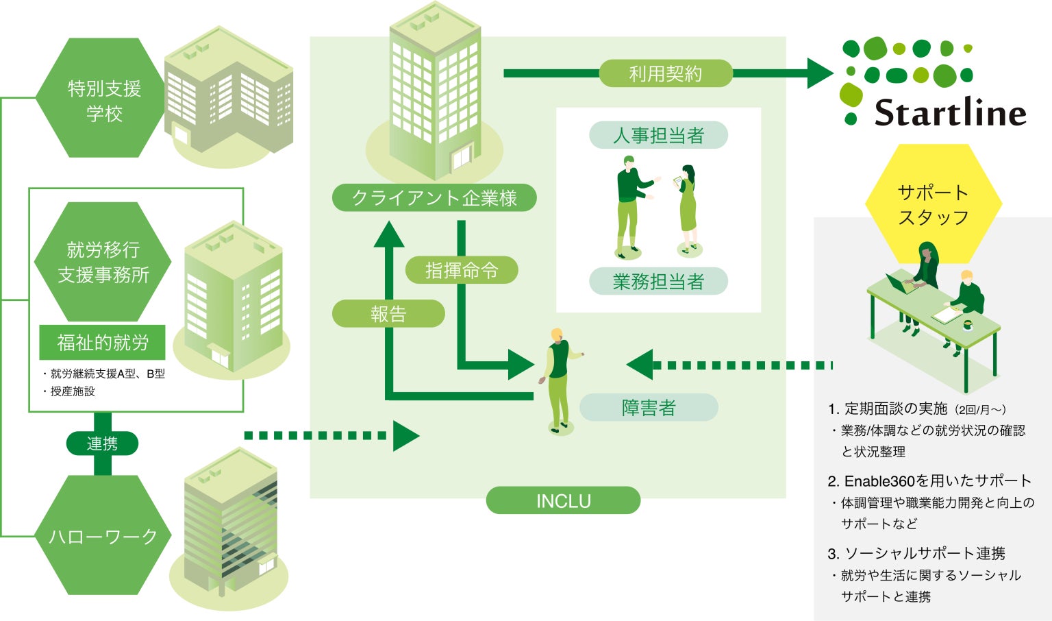 INCLUは、職域開拓や採用、適性判断やチームビルディング、定着や能力開発に関する相談までトータルで支援します。