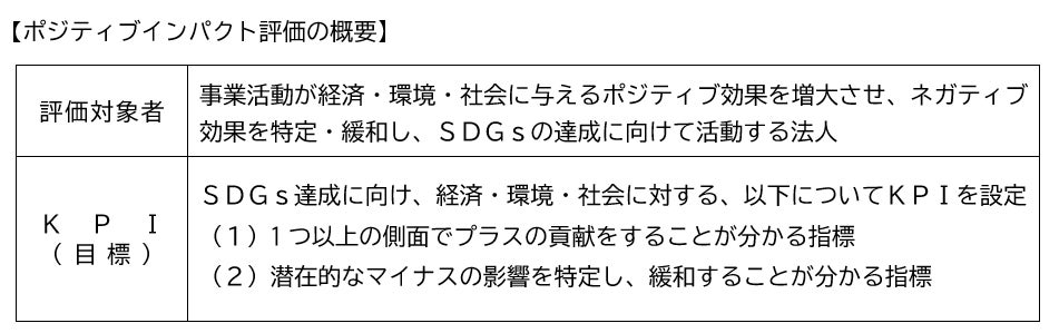 ポジティブインパクト評価とは、企業活動が経済・環境・社会に与えるインパクト(ポジティブならびにネガティブな影響)を包括的に分析・評価するもので、企業活動の継続的な支援を目的としています。