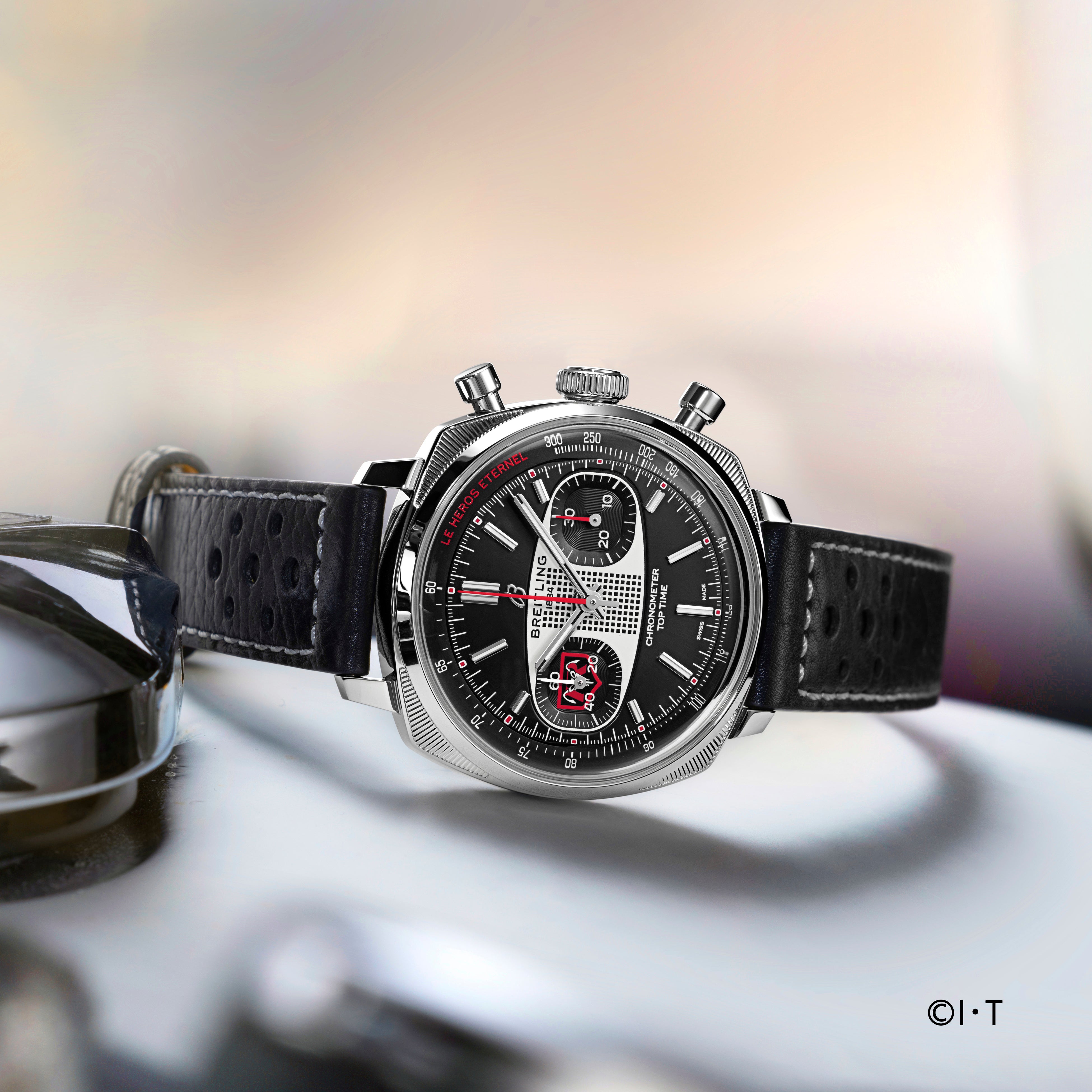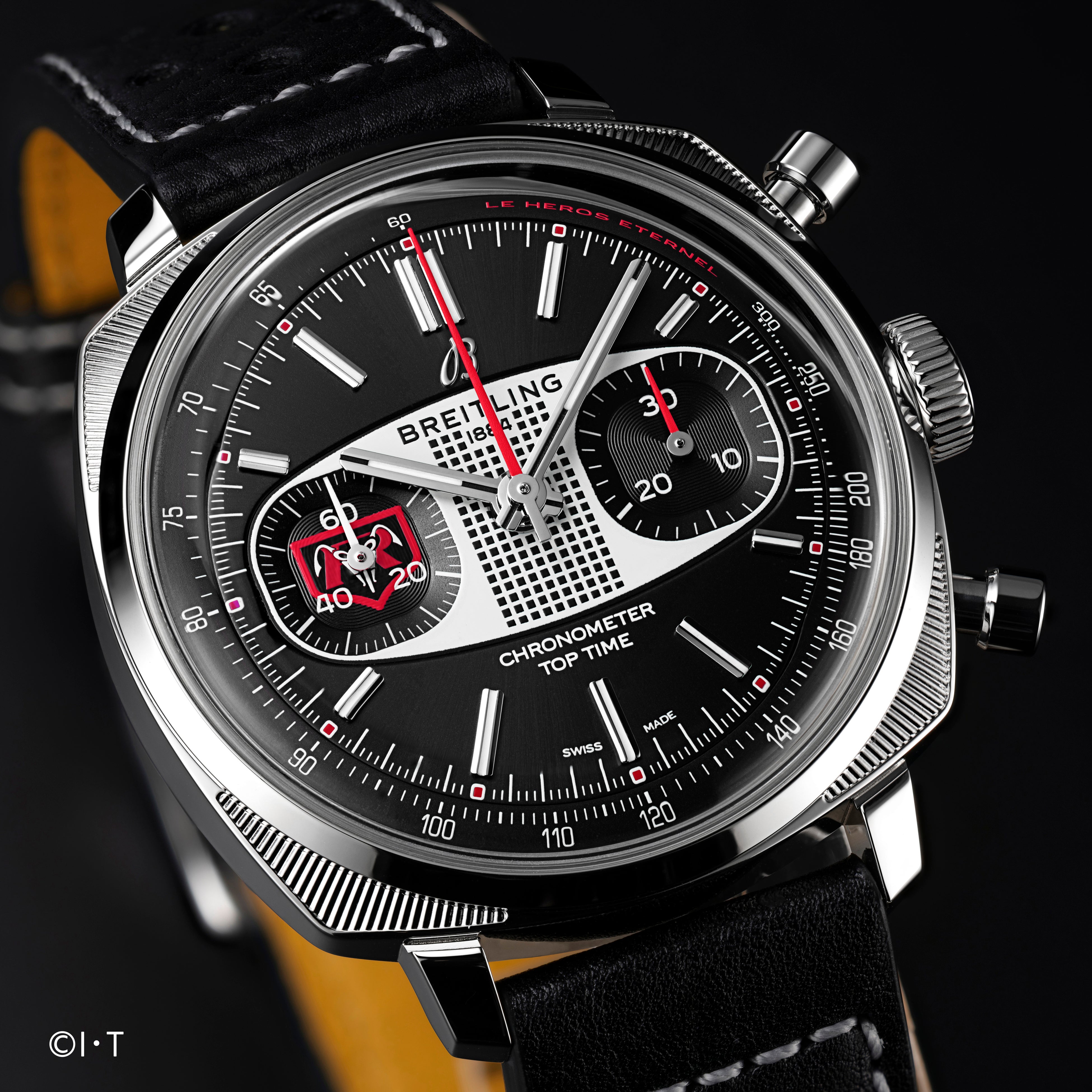 仮面ライダー放映55周年を記念して誕生した日本限定モデル。1960年代に誕生したブライトリングのレーシング・クロノグラフ「トップタイム」の精神を受け継ぎ、ヒーローの世界観をさりげないディテールで表現しています。