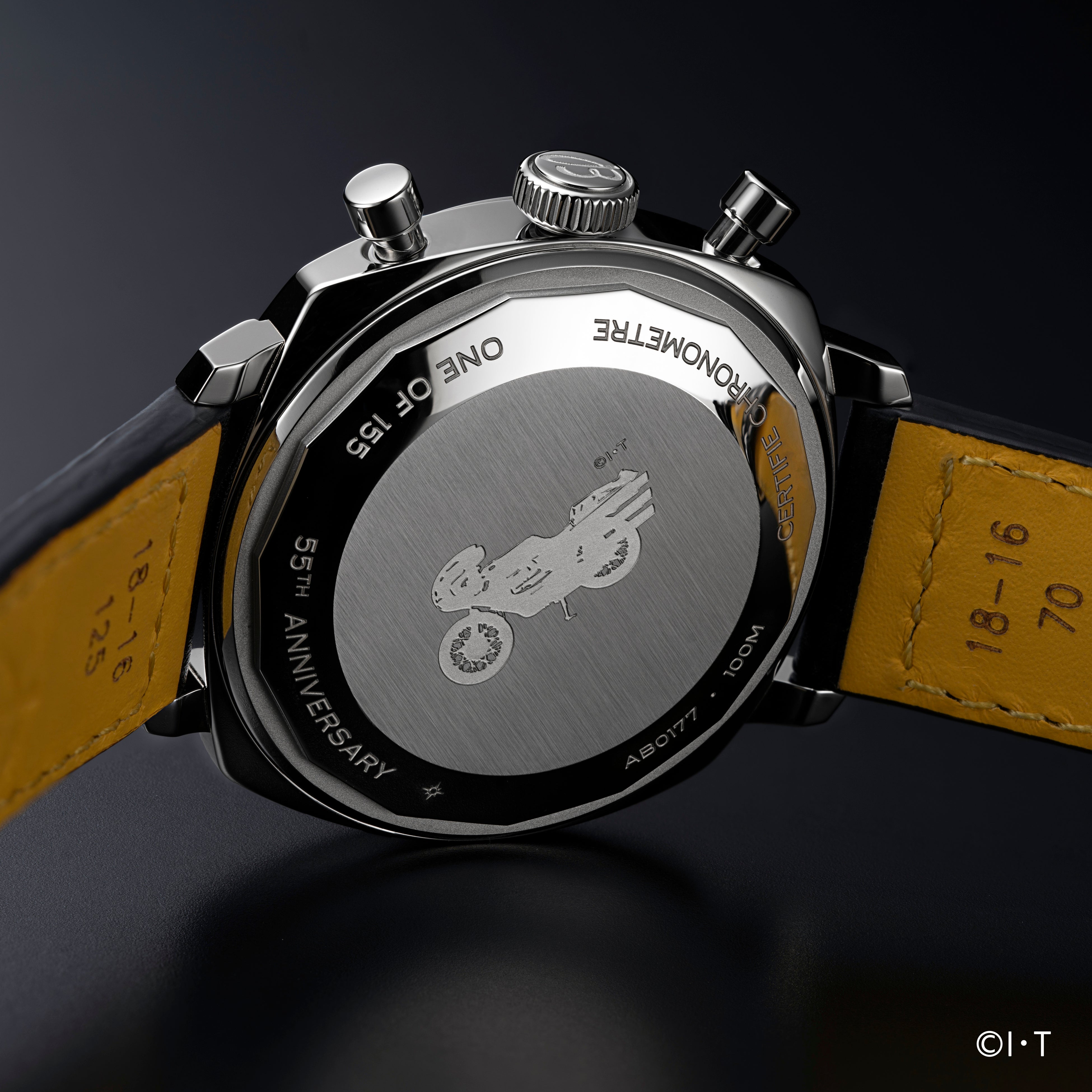 9時位置のスモールセコンドにはエンブレムを配し、文字盤外周には「LE HÉROS ÉTERNEL(永遠のヒーロー)」の文字を刻印。ケースバックにはサイクロン号のシルエットと“ONE OF 155”の刻印を施し、限定モデルであることを静かに語ります。