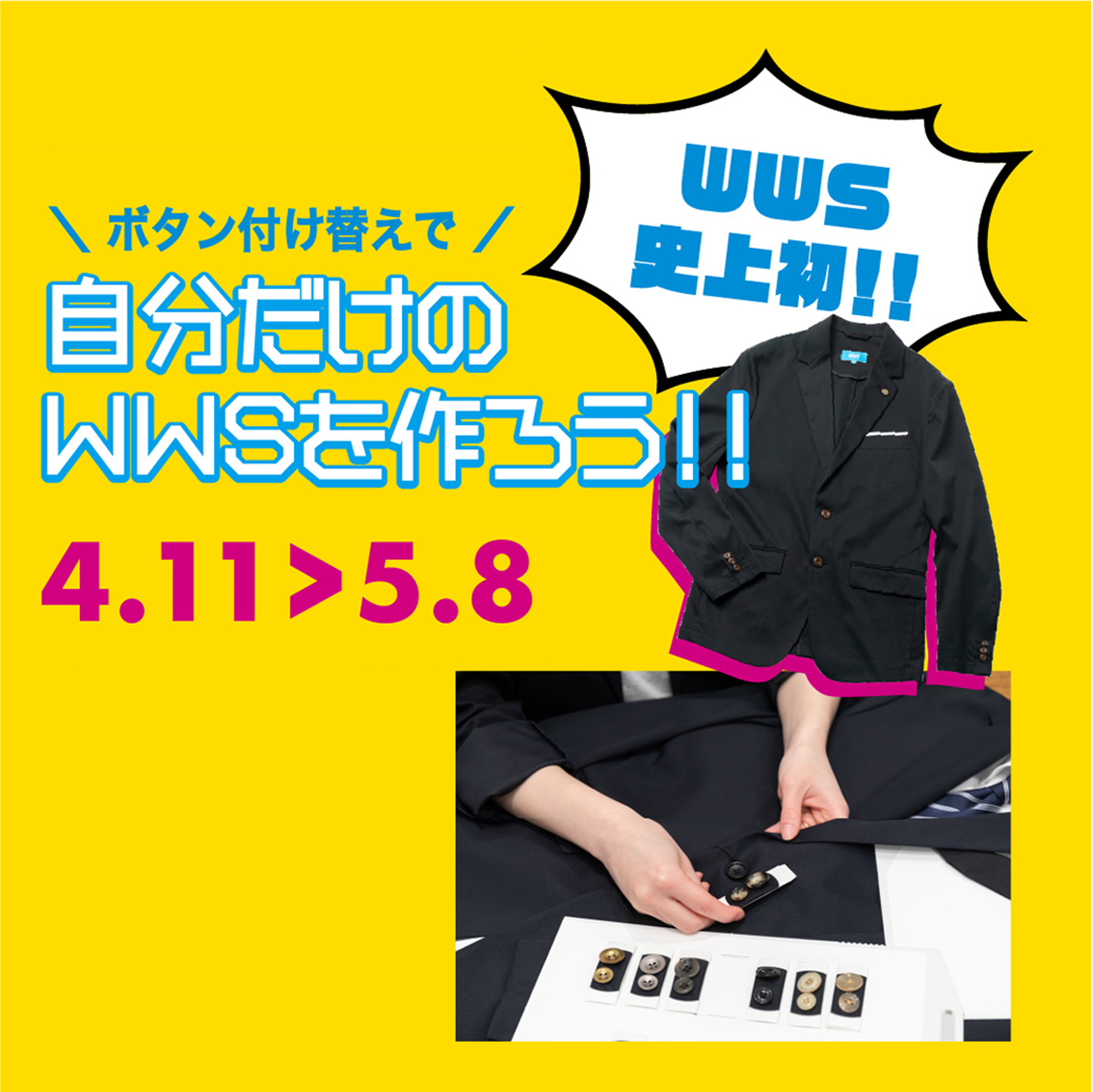 内容:期間内にジャケット・シャツを購入頂き、用意した10種類のボタンの中から好きなものにカスタム可能できるWWS史上初のカスタムイベント。※ジャケットのみ既にお持ちのWWSでも参加可能です。