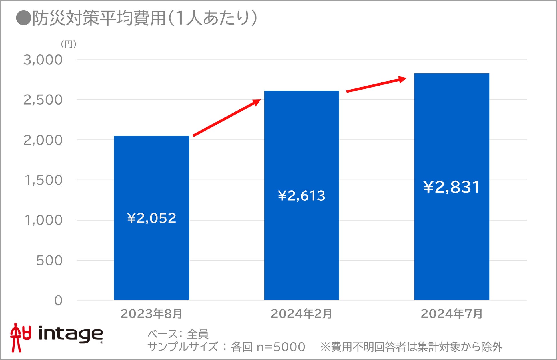 次に、防災対策費用を見てみます。以下の通り、過去1年間にかけた費用は、1人あたり平均2,831円となりました(図表2)。前年比で138.0%、779円の増加、今年2月からも218円上がっており、回を追うごとに増加傾向にあります。物価高によって対策費用が押し上げられている面もありますが、対策実施率も上昇していることから、生活者の防災意識が前年より高まっていることが分かります。