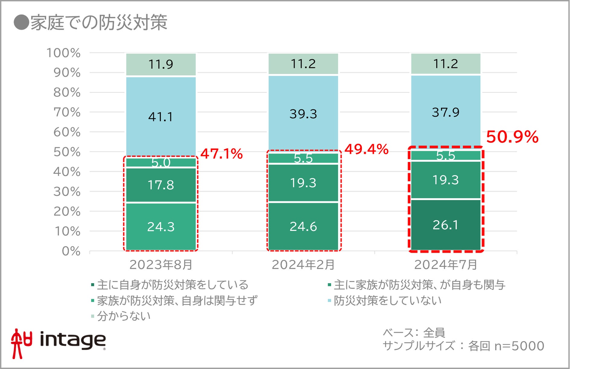 今回の調査によると、「自身もしくは家族が防災対策をしている」と回答した割合は50.9%と、前年の47.1%よりも3.8ポイント上昇。能登半島地震発生翌月(2024年2月)の調査結果と比較しても1.5ポイント増加しています(図表1)。