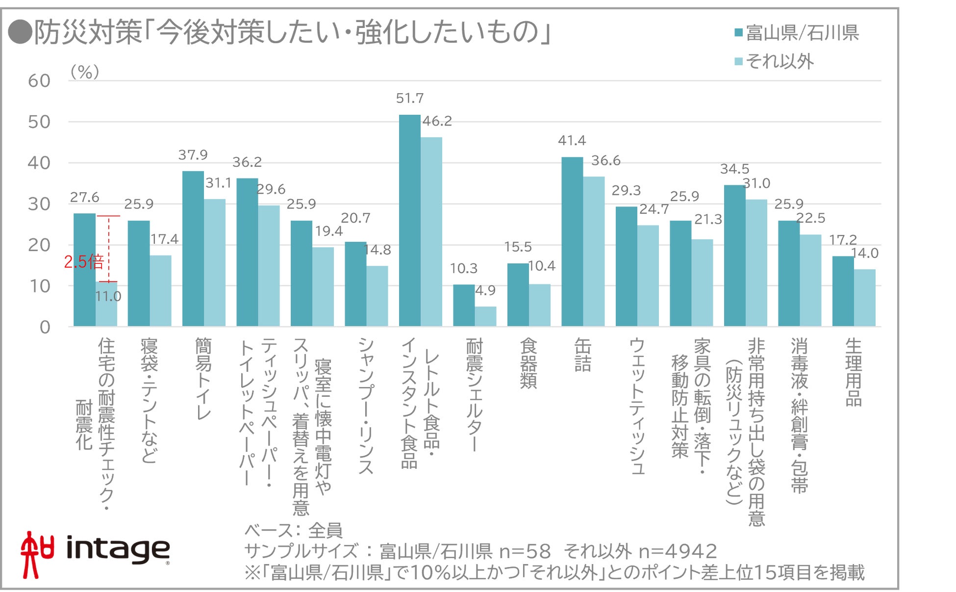 さらに、今後対策したい・強化したい防災対策を確認したところ、「住宅の耐震性チェック・耐震化」をあげた割合が、石川県・富山県在住者で27.6%、他県在住者(11.0%)のおよそ2.5倍と顕著な差が見られました(図表5)。
