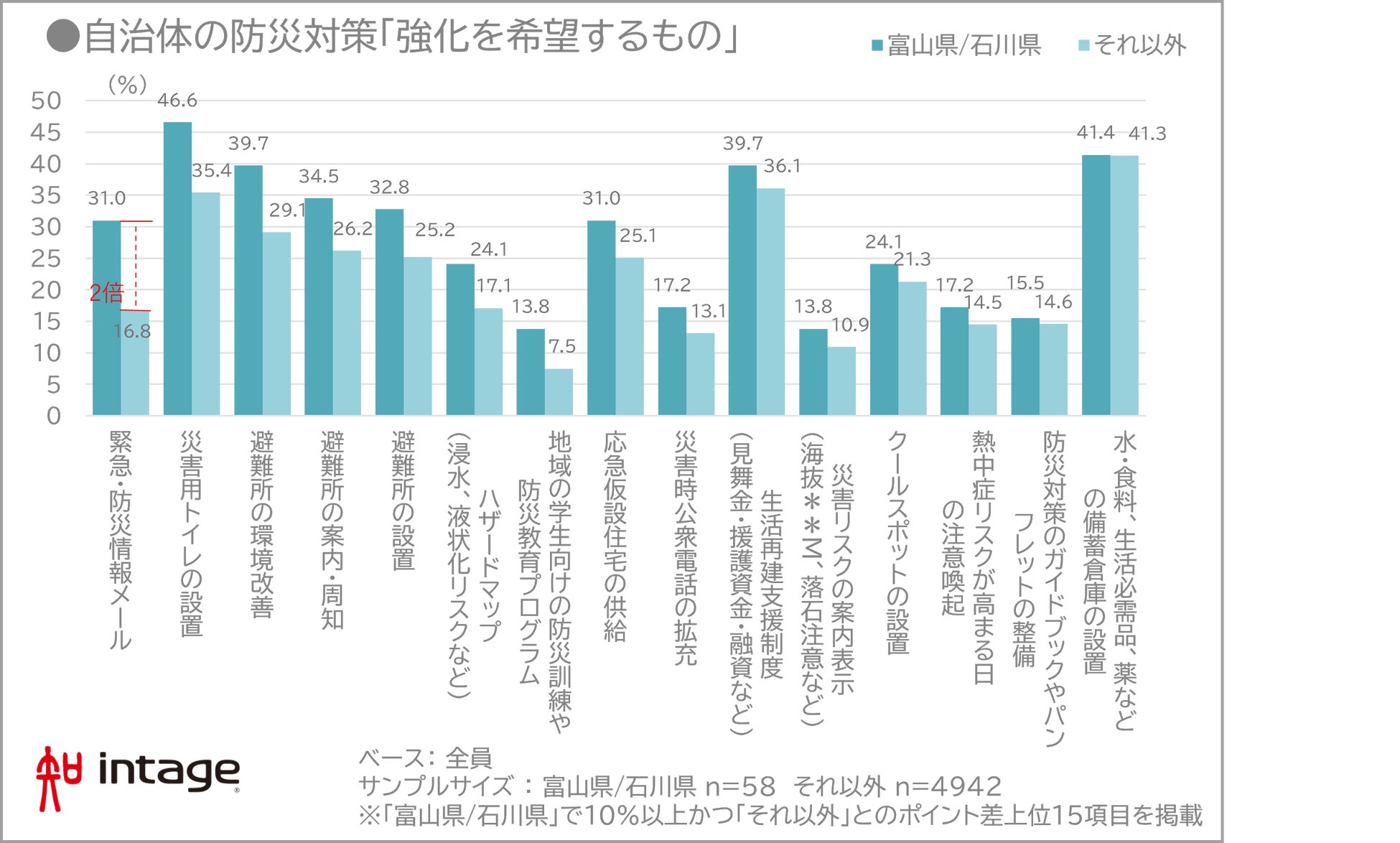 同様に、自治体の防災対策への強化希望についても見てみましょう。こちらは、「緊急・防災情報メール」が富山県・石川県在住者とそれ以外でのポイント差トップでした。およそ2倍となっています。次いで「災害用トイレの設置」「避難所の環境改善」、こちらは全国的な需要も高く、直近の両県在住者ではさらに高い結果です(図表6)。