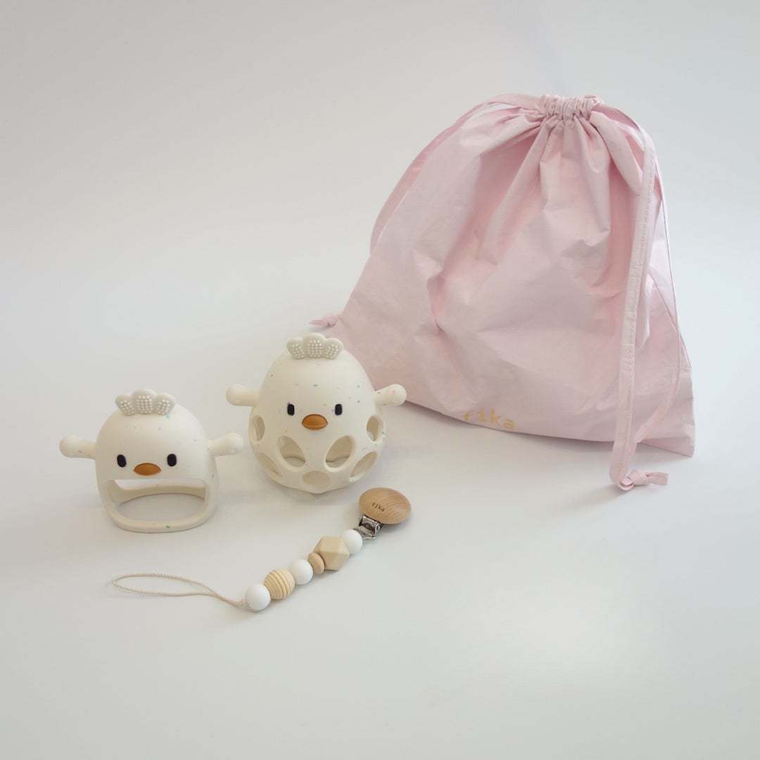 『fika(フィーカ)』の「ラッキーパック」(税込4,400円)を数量限定で販売!にわとりのCoccoのシリコーントイが主役のセット。ホワイト、モカ、ピンクの3カラー展開です。