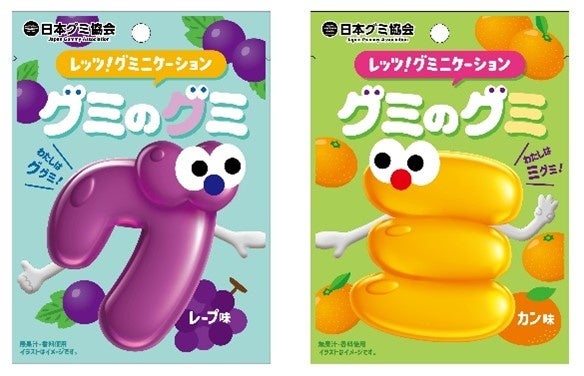 「グミのグミ」は「グ」型のグレープ味のグミと、「ミ」型のミカン味のグミの2種類です。2種類を組み合わせることで「グミ」の文字を作ることができます。