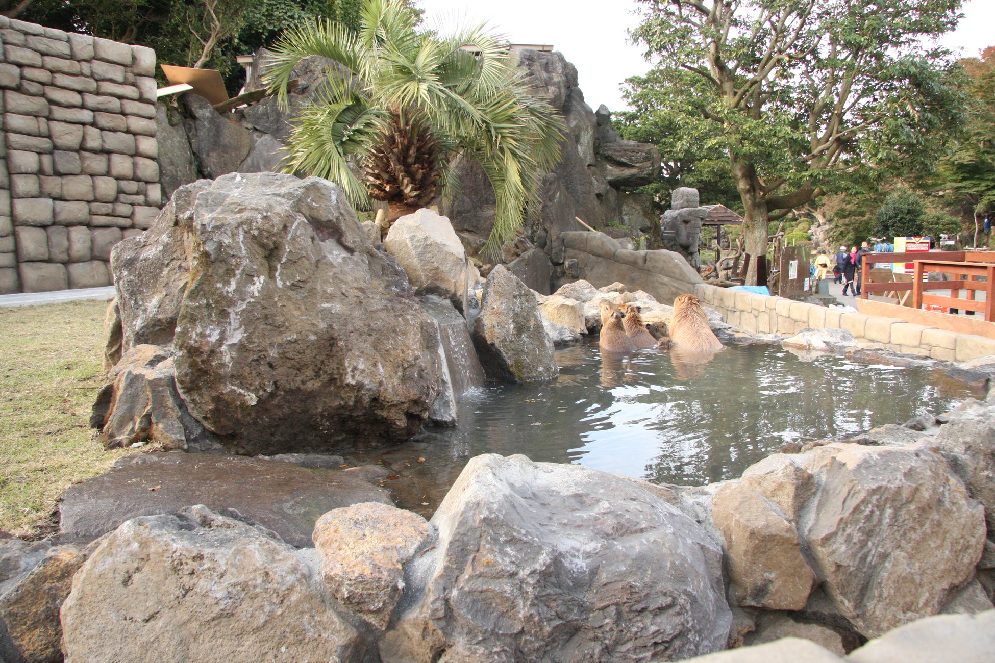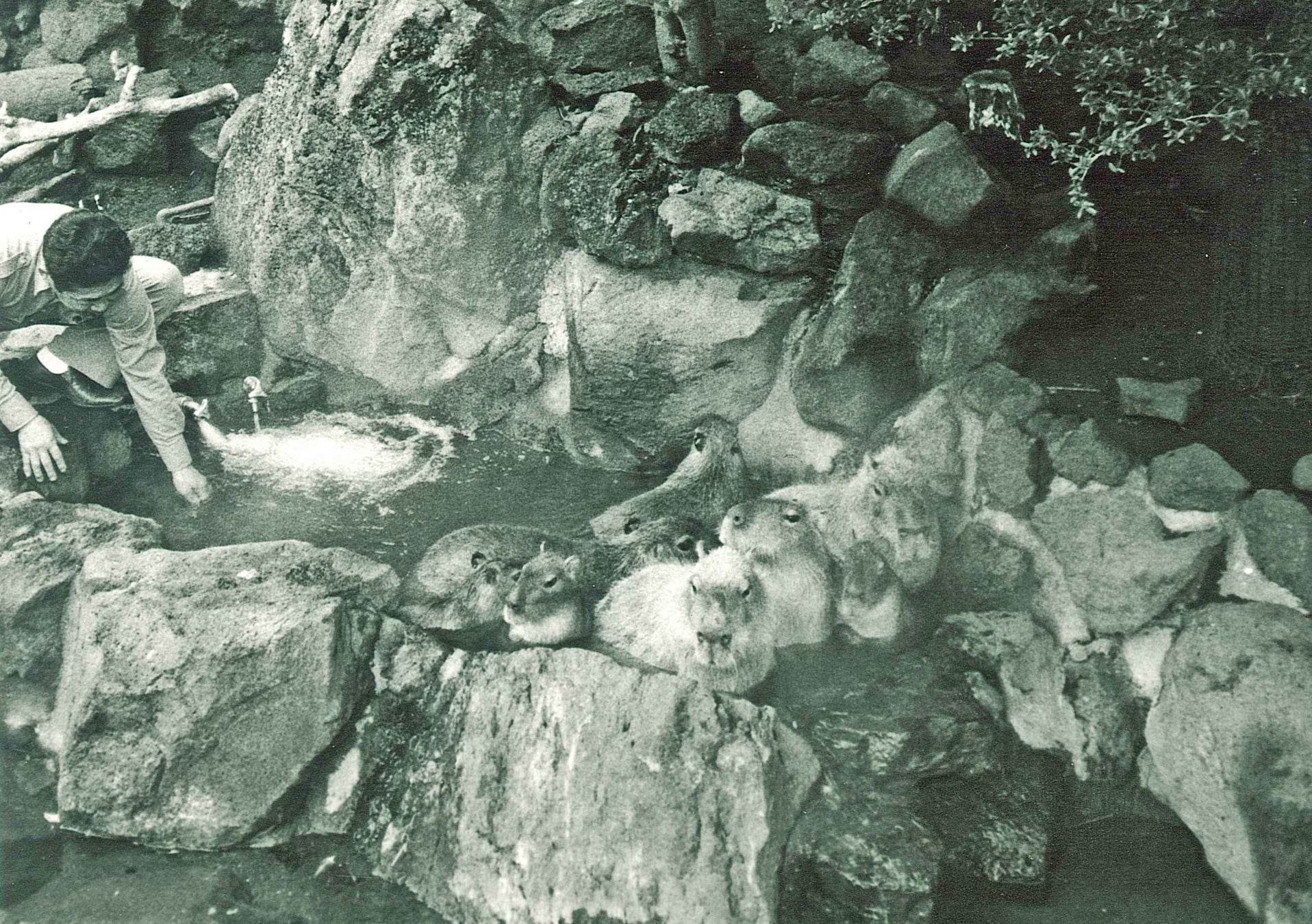 園では、1966年からカピバラの飼育を始めました。いまや動物園の人気者となったカピバラも、当時の国内ではまだとても珍しい動物でした。そして今から43年前の1982年の冬、飼育スタッフがお湯を使ってカピバラの展示場を掃除していたところ、湯だまりに足や尻を浸けてくつろぐカピバラたちの姿に気づき、偶然に風呂好きなことを発見しました。これ以来、当園では毎年「カピバラの露天風呂」を開催しており、“伊豆の冬の風物詩”として多くの人々に親しまれています。