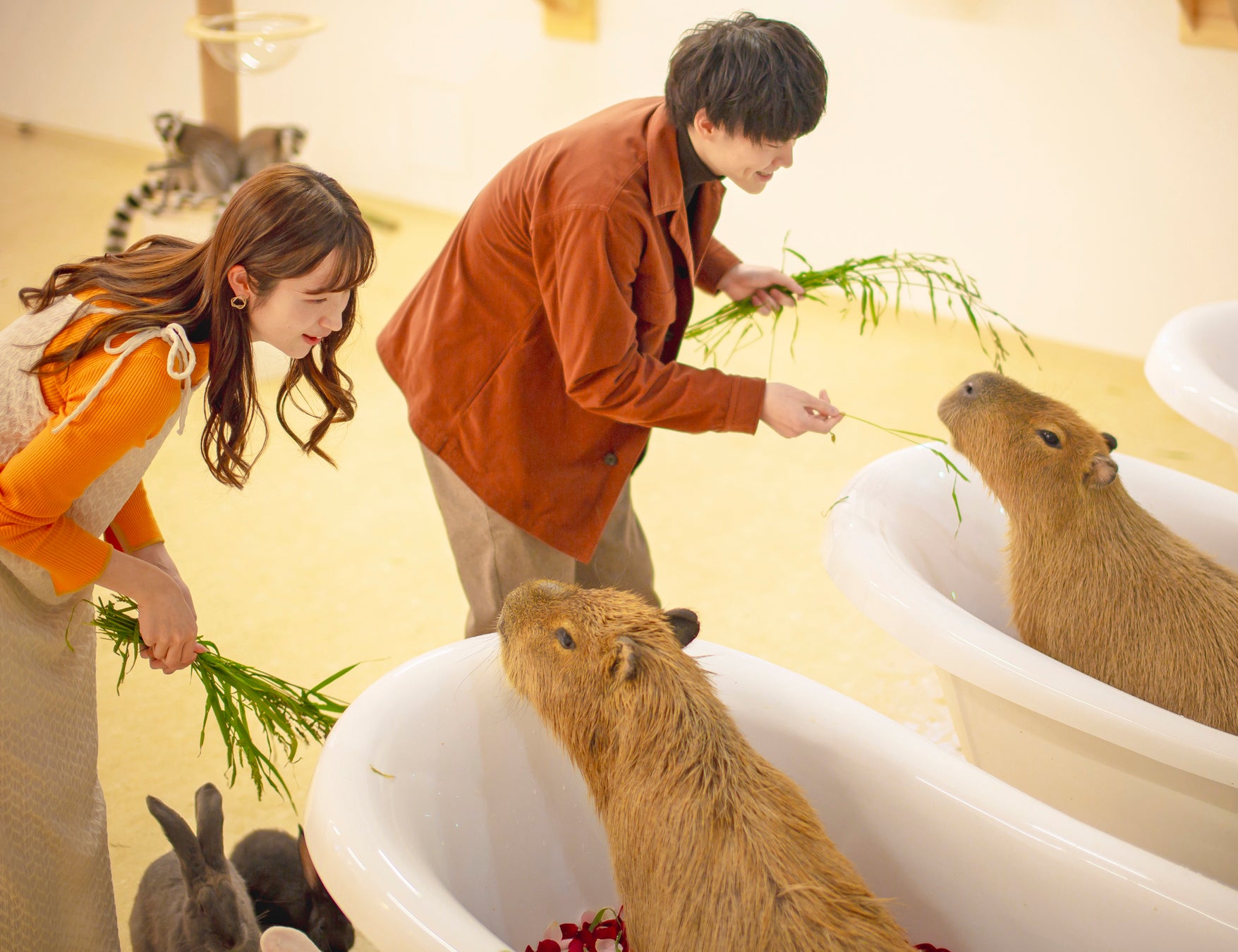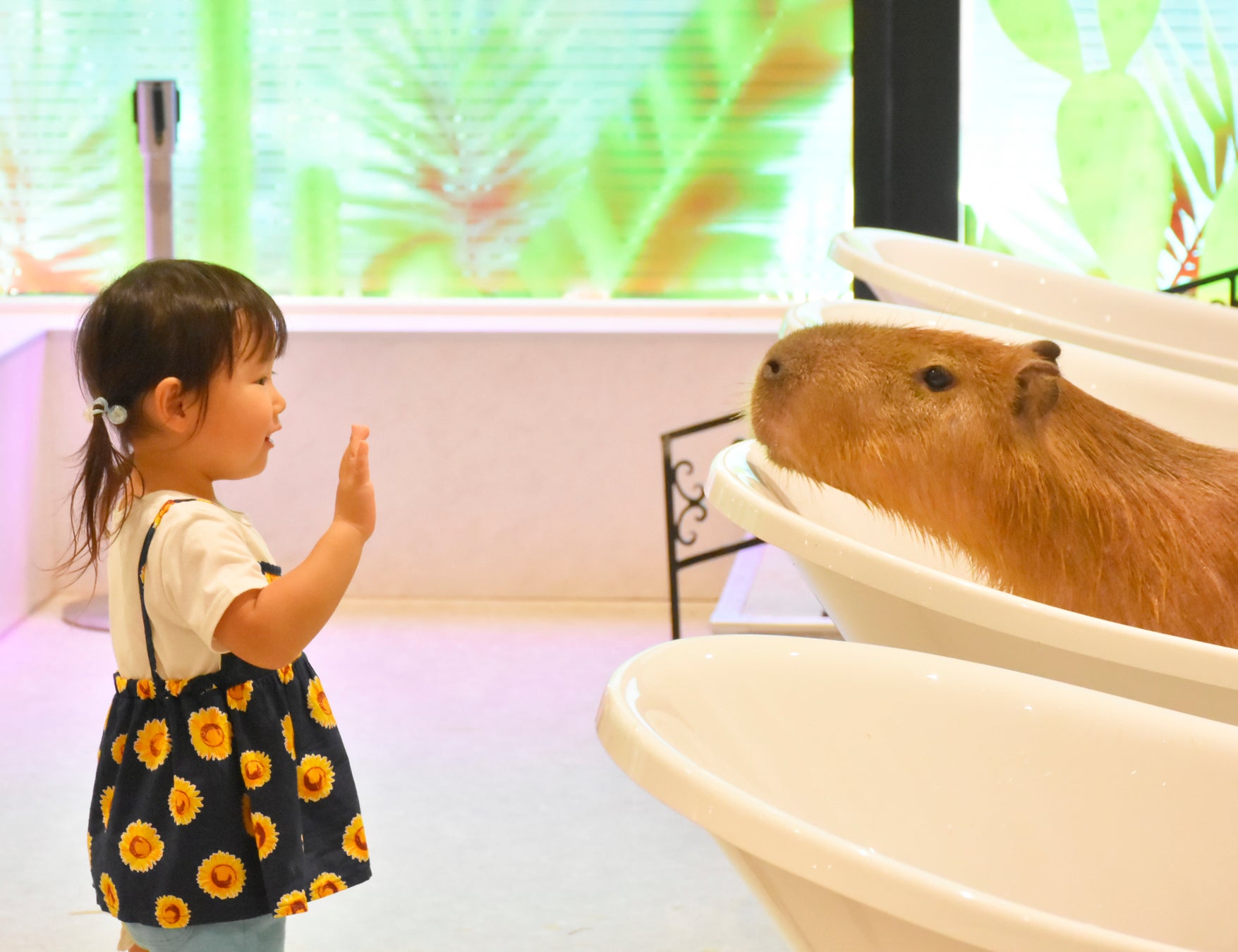 伊豆シャボテン動物公園がプロデュースする「アニタッチ」「アニタッチPARK」。多種の動物たちが暮らす魅力ある空間で、その生態を学びながらふれあえる体験ができます。伊豆シャボテン動物公園で大人気の「カピバラの露天風呂」が、アニタッチでは都会的な「猫足風呂」に変わります。