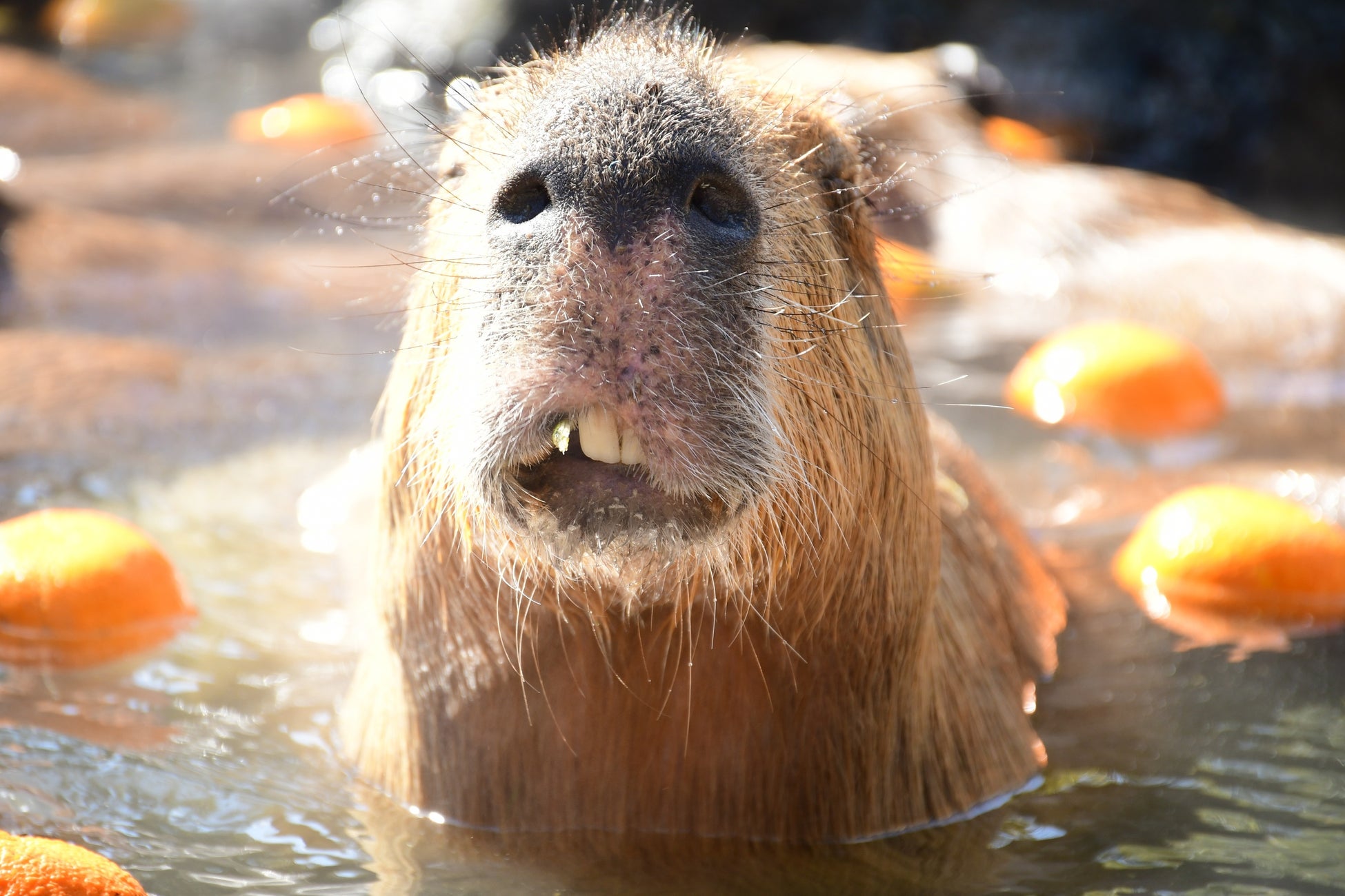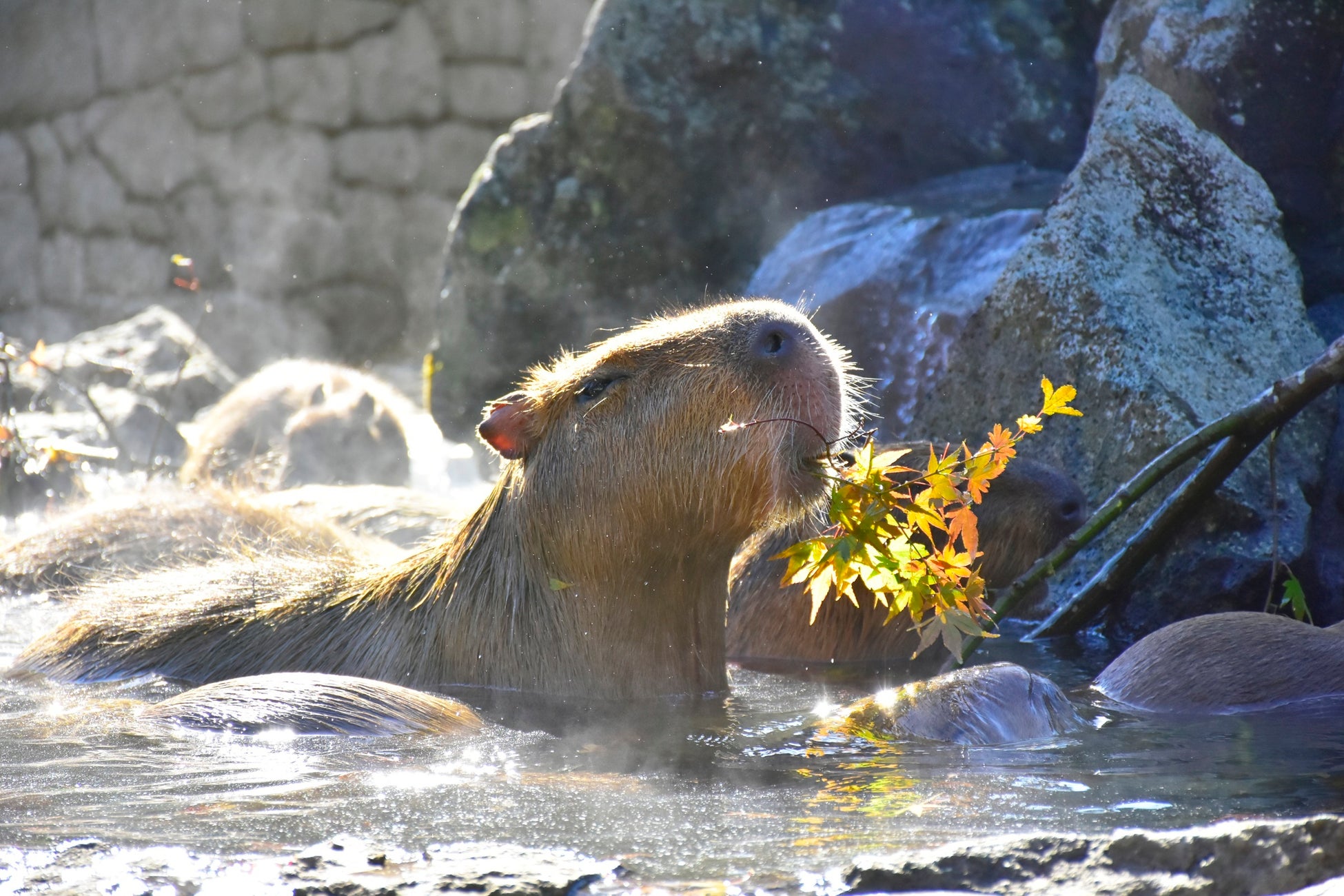 初日の2025年11月22日(土)は、10時30分からカピバラたちがテープカットならぬ青草をカット行い、今シーズンの「元祖カピバラの露天風呂」がスタートいたします。イベントスタートの3連休には、大きなゆずを浮かべた“鬼ゆずの湯”を開催、これ以降、週末や祝日と冬休み、および春休み期間は、紅葉(もみじ)・ゆず・バラ・リンゴ・野菜など趣向を凝らした“変わり湯”を開催いたします。