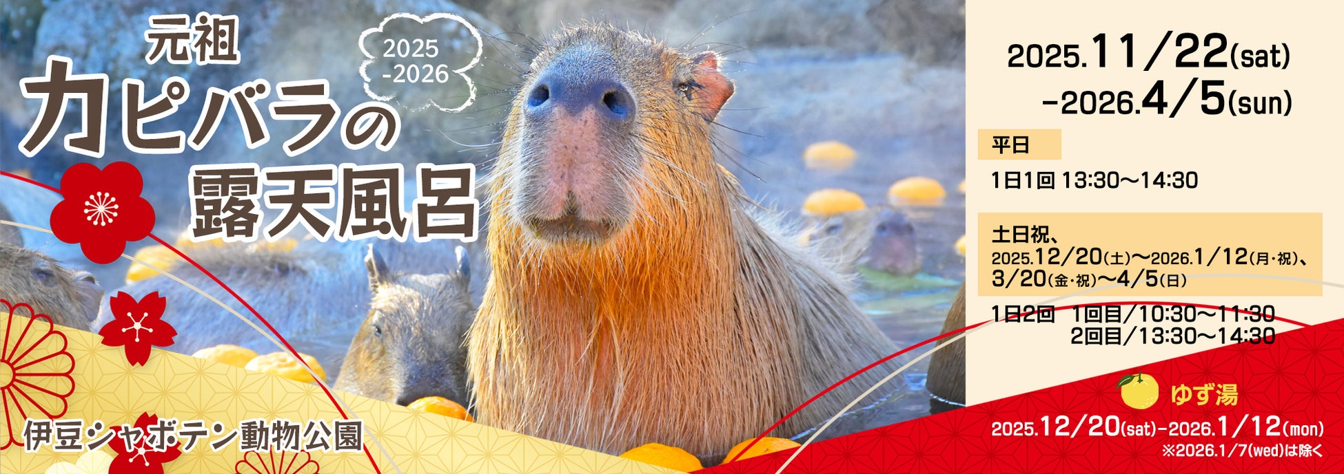 伊豆シャボテン動物公園では、2025年11月22日(土)より2026年4月5日(日)まで、「元祖カピバラの露天風呂」を開催いたします。イベント期間中、平日は13時30分からの1日1回、土曜・日曜・祝日と冬休みおよび春休みの期間には、10時30分からと13時30分からの1日2回、カピバラたちが露天風呂に入ります。