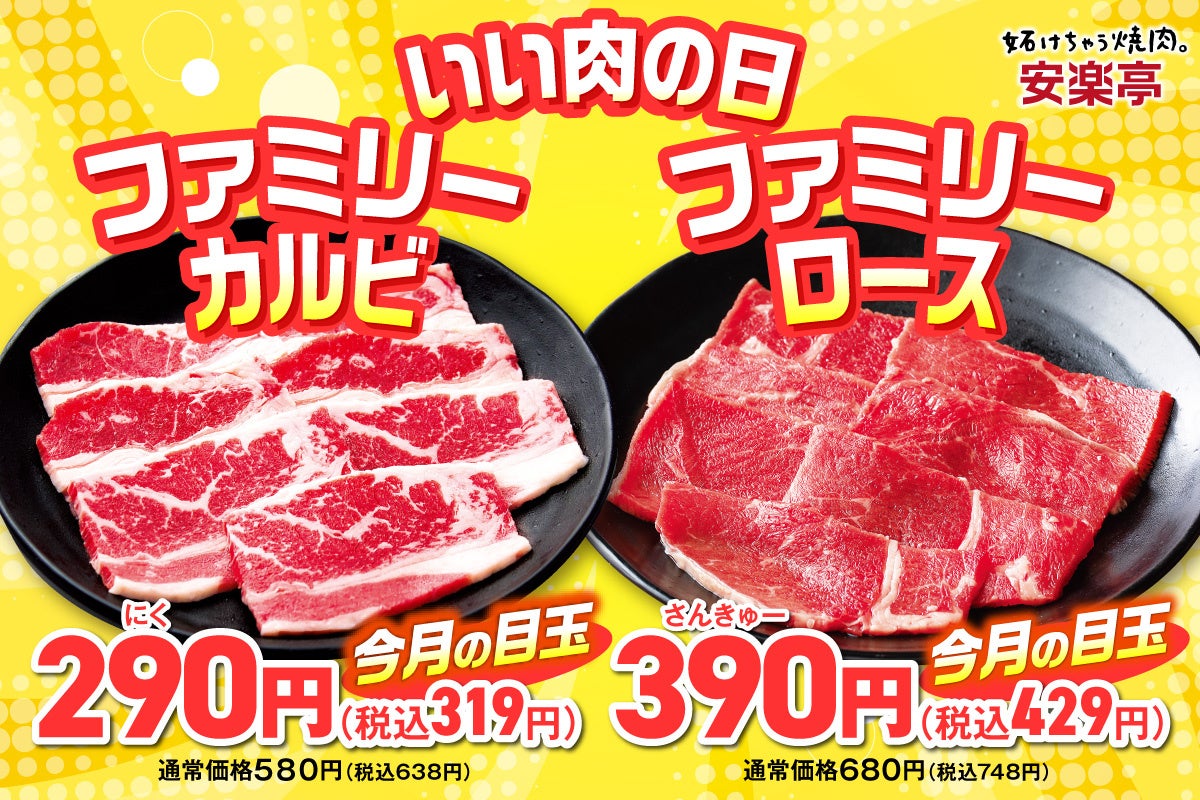 今月の肉の日は年に一度の“いいにくの日”です。いつもにもましてお得度がパワーアップ!!人気定番焼肉や上質焼肉が特別価格!さらに食べ盛りの小学生も、こころおきなくお肉を楽しめる食べ放題特別価格など、ご家族でも楽しめるキャンペーンです!