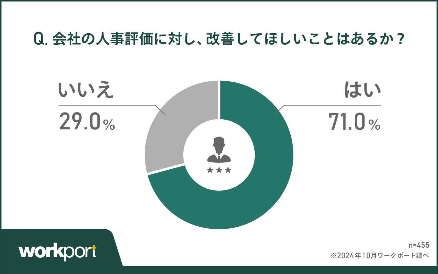 最後に、対象者全員に会社の人事評価に対し、改善してほしいことはあるか聞いたところ、71.0%の人が「はい」と回答しました。