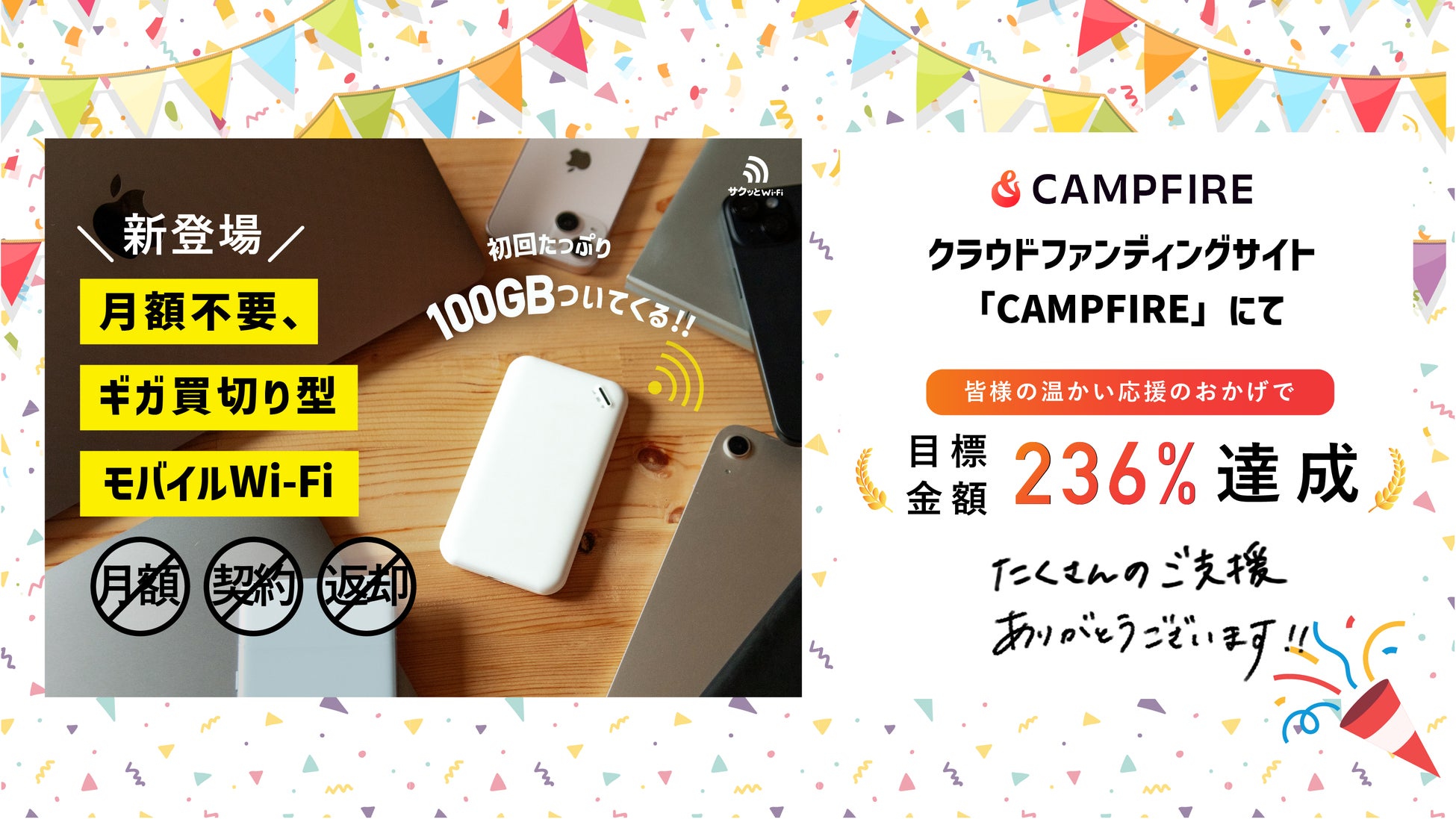 なお、業界最安値※のギガ買い切り型モバイルWi-Fi 「サクッとWi-Fi」は、クラウドファンディングサイト「CAMPFIRE」にて2025年1月19日(日)まで予約販売を実施いたします。今回ご支援いただいた方々への感謝の気持ちとして、目標300%達成した暁には、有効期限1年の海外利用ギガチャージを15%OFFで購入することが出来るクーポンを発行いたします。
