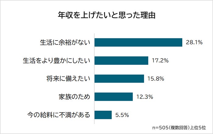 「年収を上げたいと思った理由」の1位は「生活に余裕がない(28.1%)」で、全体の3割近く。多くの人にとって「収入の不足感」が、直接的な動機となっていることがわかります。