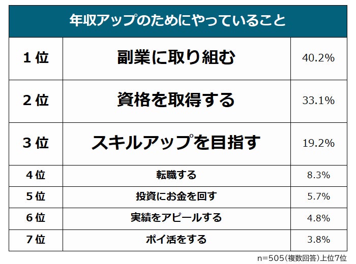 社会人505人に「年収アップのためにやっていること」を聞いたところ、1位は「副業に取り組む(40.2%)」で全体の4割を占めました。