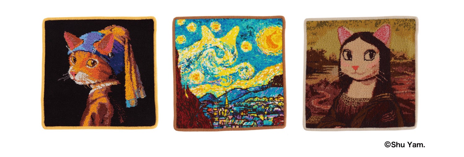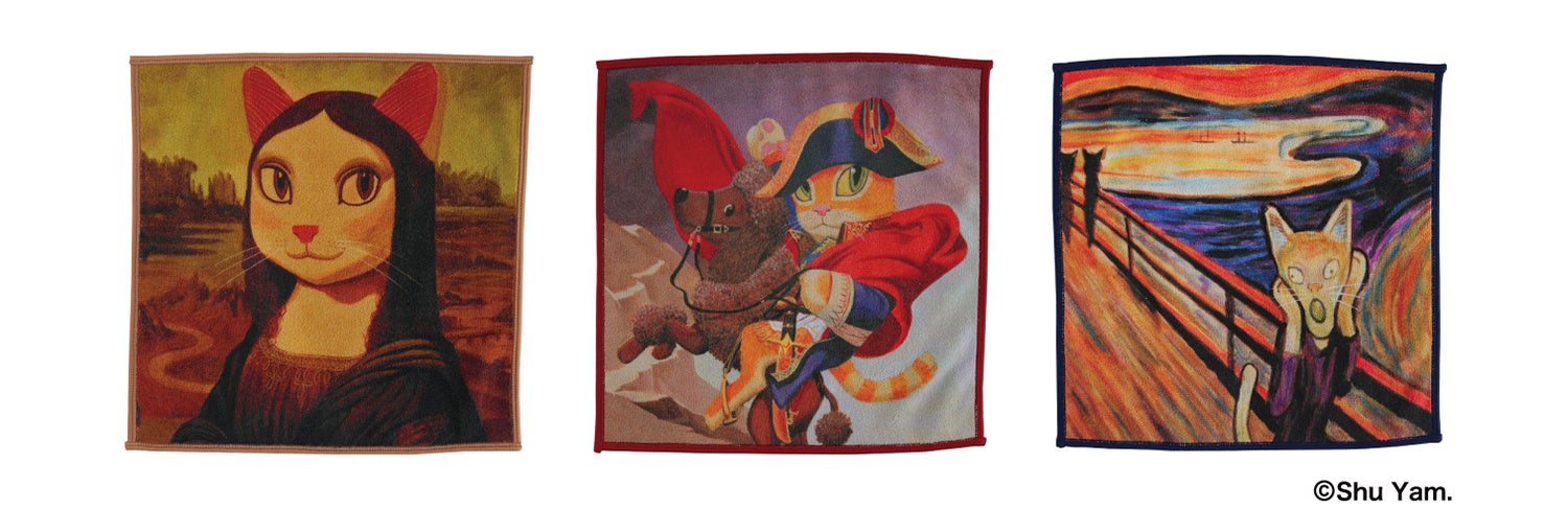 海外で活躍中の画家シュー・ヤマモト氏が描いた『キャットアート』のハンカチやタオルを「池袋、銀座、有楽町、博多」の4か所の自動販売機で期間限定販売!