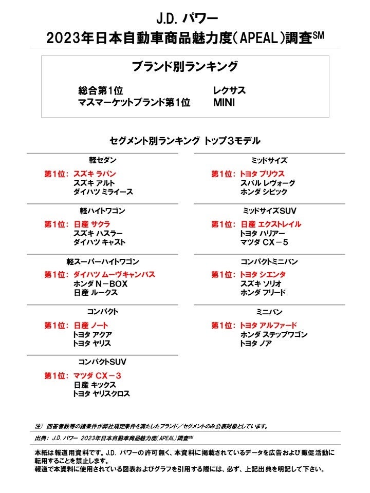 CS(顧客満足度)に関する調査・コンサルティングの国際的な専門機関である株式会社J.D. パワー ジャパン(本社:東京都港区、代表取締役社長:山本浩二、略称:J.D. パワー)は、J.D. パワー 2023年日本自動車商品魅力度(Automotive Performance, Execution and Layout、略称APEAL)調査℠の結果を発表した。