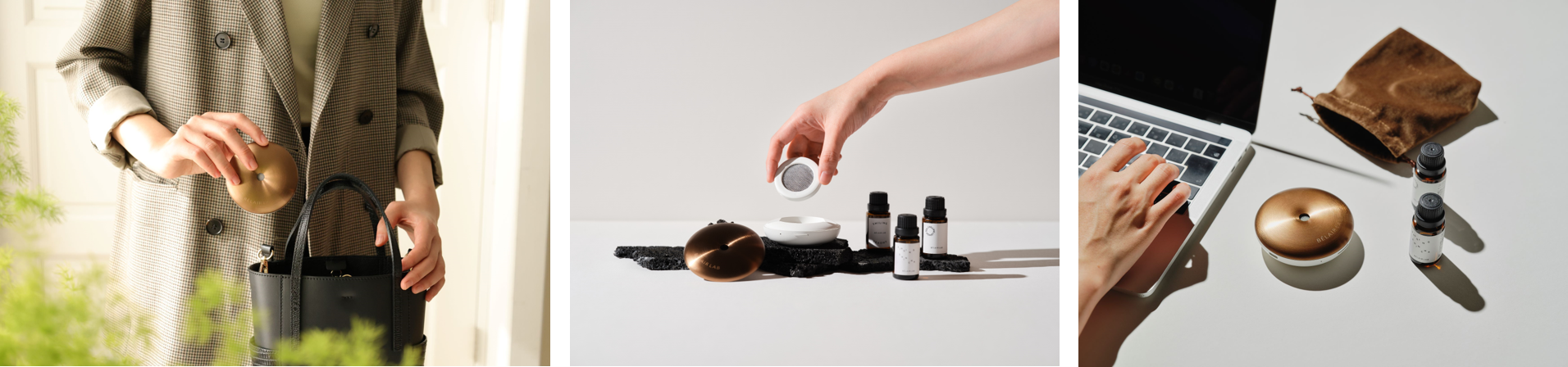アロマホルダーに内蔵された5層構造の空気清浄フィルターが、ホコリや花粉をキャッチ。さらに、香りの吹き出し口からはマイナスイオンも発生します。フィルターを通った空気が美しい香りとともにパーソナルスペースに広がり、心地よい時間をもたらします。