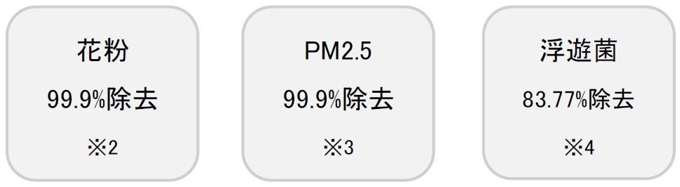 ※2.●試験機関:Intertek Testing Services Shenzhen●試験方法:40Lの密閉空間に花粉(4 ~ 9 粒/㎤)を吹き込み、30分後、60分後にそれぞれ除去率を測定。■試験結果:60分で除去率99.9%。*L[弱]モード運転にて測定。実使用空間での効果とは異なります。
