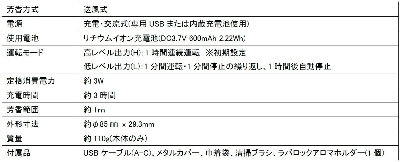 -利便性:香りを変えたいときは、別売りの「ベレアラボ ラバロックアロマホルダー」を替えてご使用頂くだけで完了。煩わしい本体の洗浄などは必要ありません。更に、3時間の充電で約14時間※6使用でき、持ち運びに最適な仕様です。 ※6.L[弱]モードで使用時