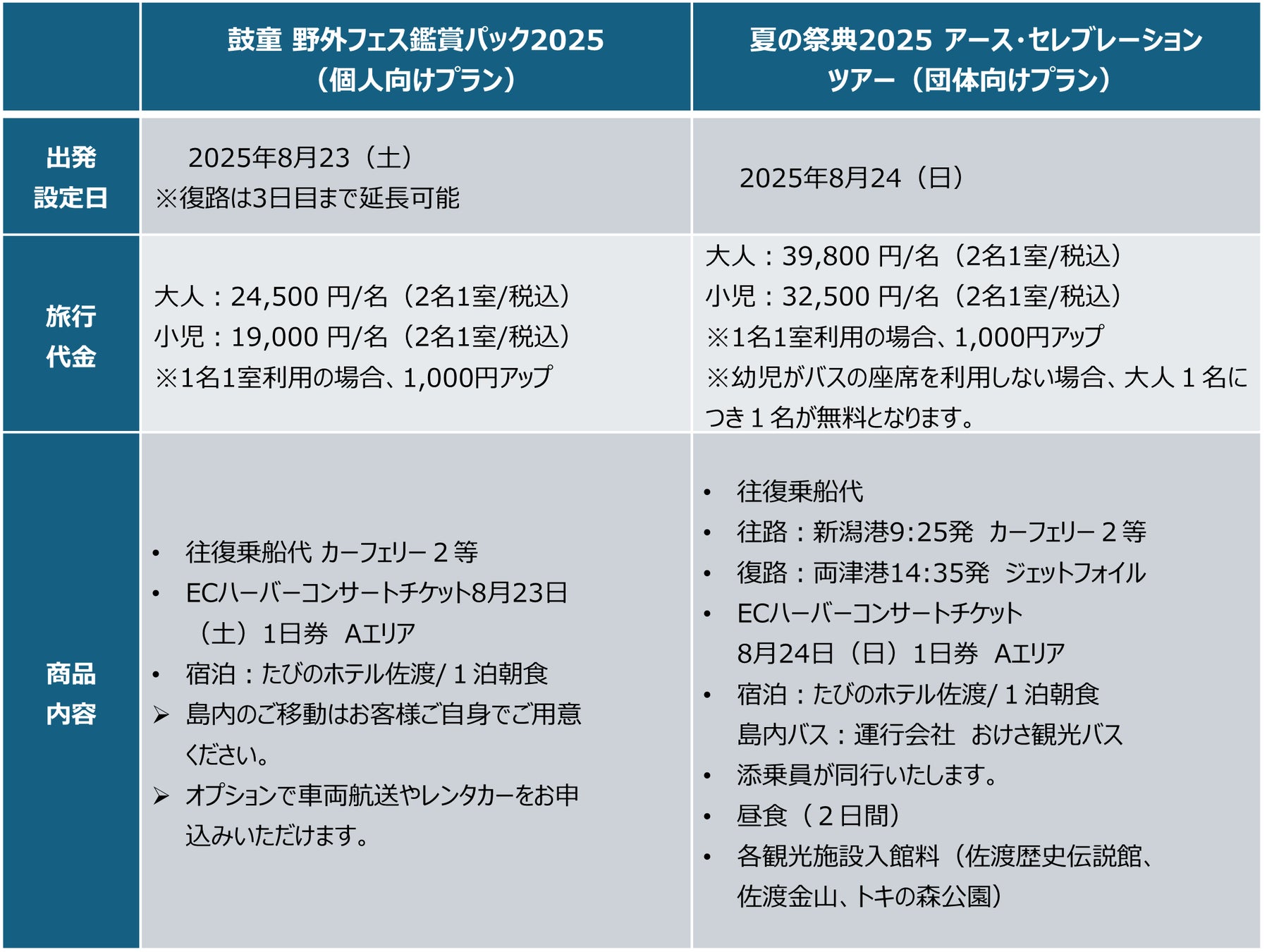 今年は個人向けプランの「鼓童 野外フェス鑑賞パック2025」と団体向けプランの「夏の祭典2025 アース・セレブレーションツアー」をご用意。個人向けプランは8月23日(土)のハーバーコンサートチケットと往復乗船代、宿泊がセットになったお得なパッケージです。グルメや観光をご自由にお楽しみいただけます。団体向けプランは、添乗員同行で8月24日(日)のハーバーコンサートチケット付きのツアーです。ECの翌日には、佐渡金山やトキの森公園など、佐渡島の定番観光地をガイド付きで巡ります。