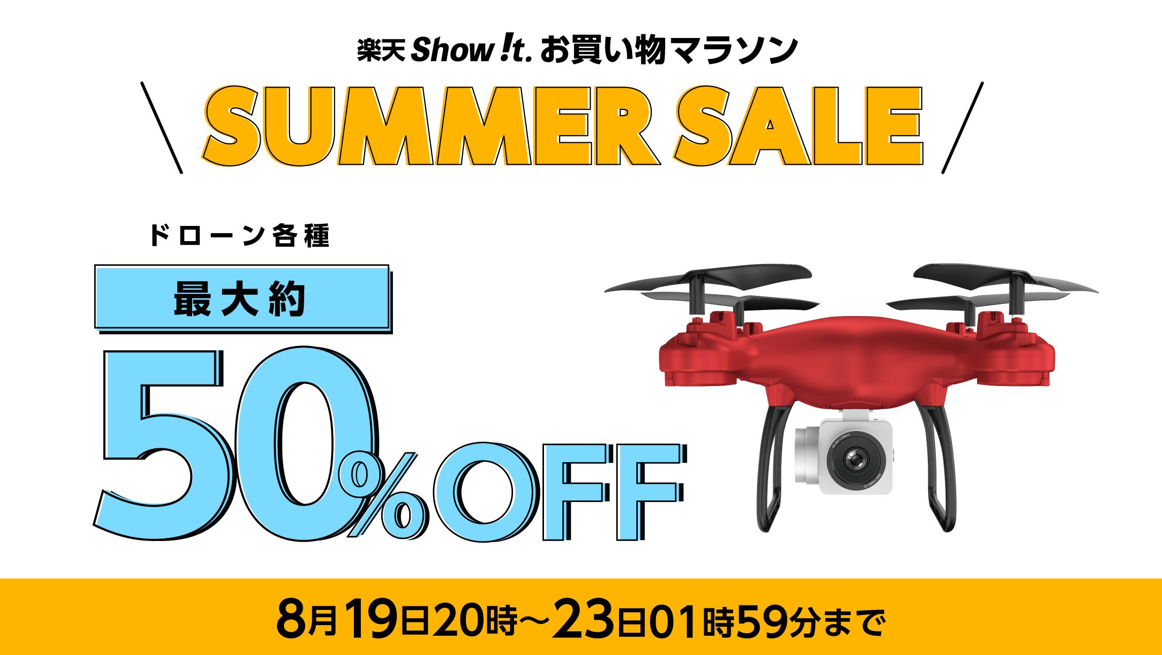楽天市場「Show it」サマーセール!私有地で上空からの撮影と運転操作を楽しめるドローンを、お買い得価格で販売。さらに、楽天お買い物マラソンでポイント10倍プレゼントを実施。