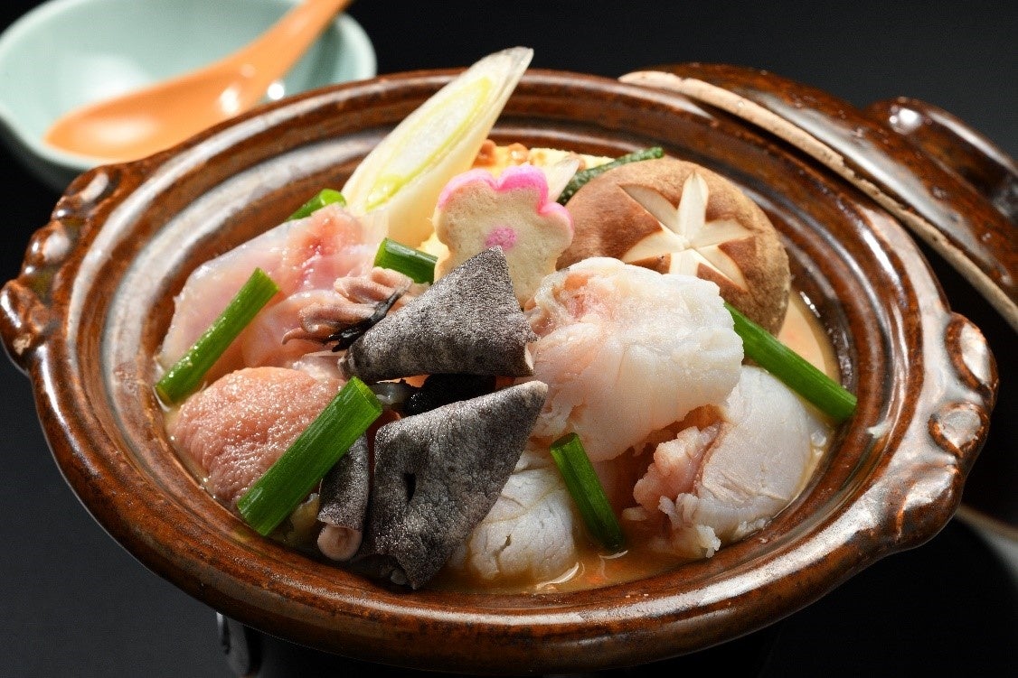 あんこうの柔らかく瑞々しい身、コラーゲンたっぷりの皮、コリコリとした食感がクセになる胃など、あんこうを惜しみなく使用。特製だしには濃厚なあん肝と味噌を加え、うま味を引き立てた、味だけではなく多彩な食感も楽しめる。