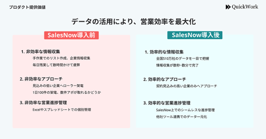 日本全国約510万社の企業データを基盤に営業の効率化を支援する「SalesNow」と組み合わせることで、受注角度の高い企業を抽出したり、セールス業務を自動化したりと営業効率を最大化することを目指していくことができます。