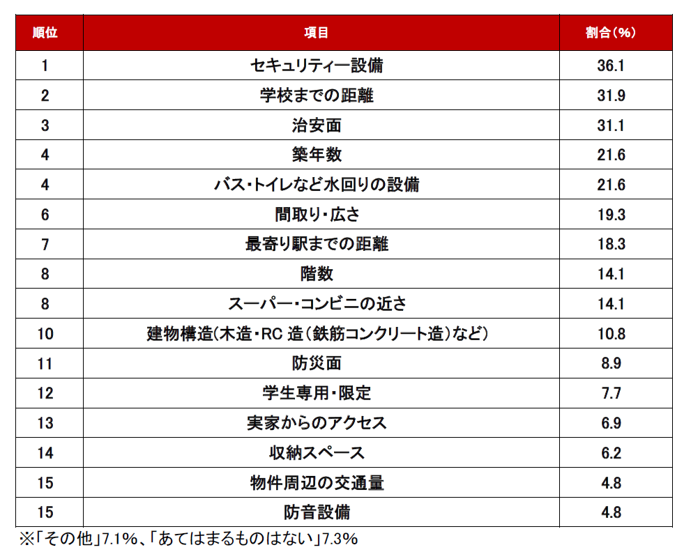 次いで、2位は「学校までの距離」でした。「学生は学校から少し遠くても、アルバイト先や繁華街が近いエリアを希望する」「親は交通費の節約にもなるので、学校から近い方が良い」などの声があがりました。学生は学校生活だけでなく、プライベートの充実を視野にいれた住まい探しをする傾向が見受けられます。