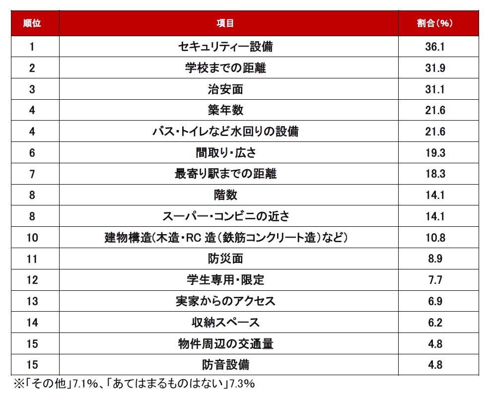 不動産のプロが選ぶ!「初めての住まい探しで、学生の親子ですれ違う条件」ランキング