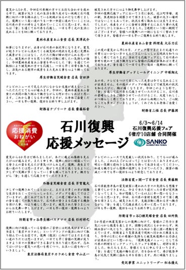 株式会社SANKO MARKETING FOODS(以下「当社」)では、農林水産省の職員食堂「あふ食堂」をはじめとする当社運営食堂において、生産者と共に汗をかき、日本の食文化を守るべく、産地の活性化に向けた『価値ある食文化の提案』をしております。本年6月にはその一環として、令和6年能登半島地震により甚大な被害を受けた石川県の農水産物を提供する「石川県復興応援フェア」を開催いたしました。