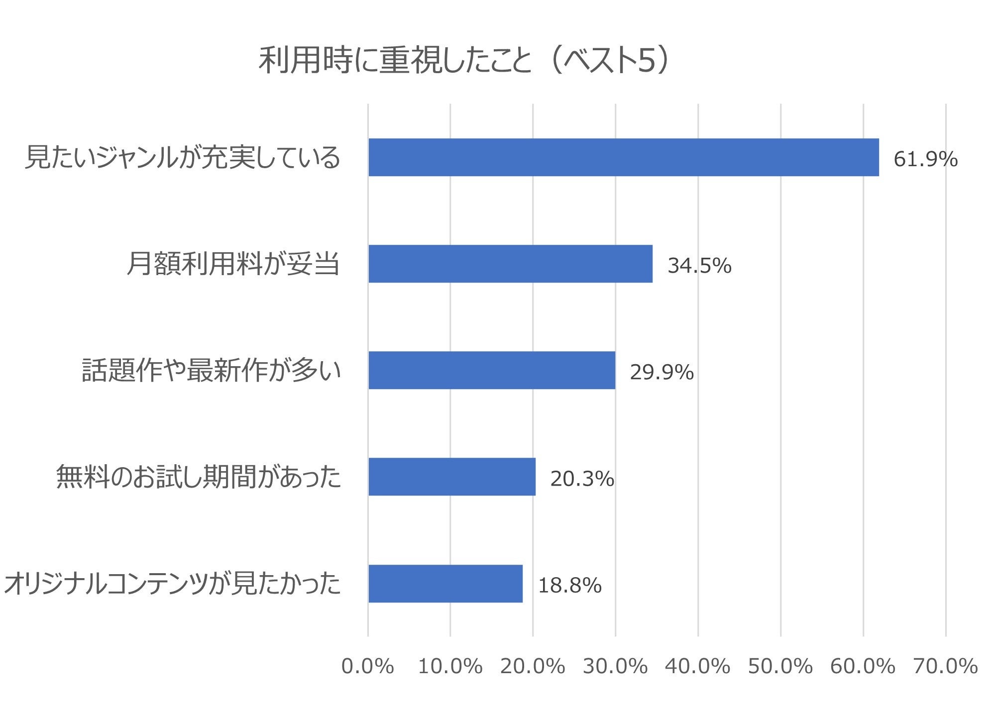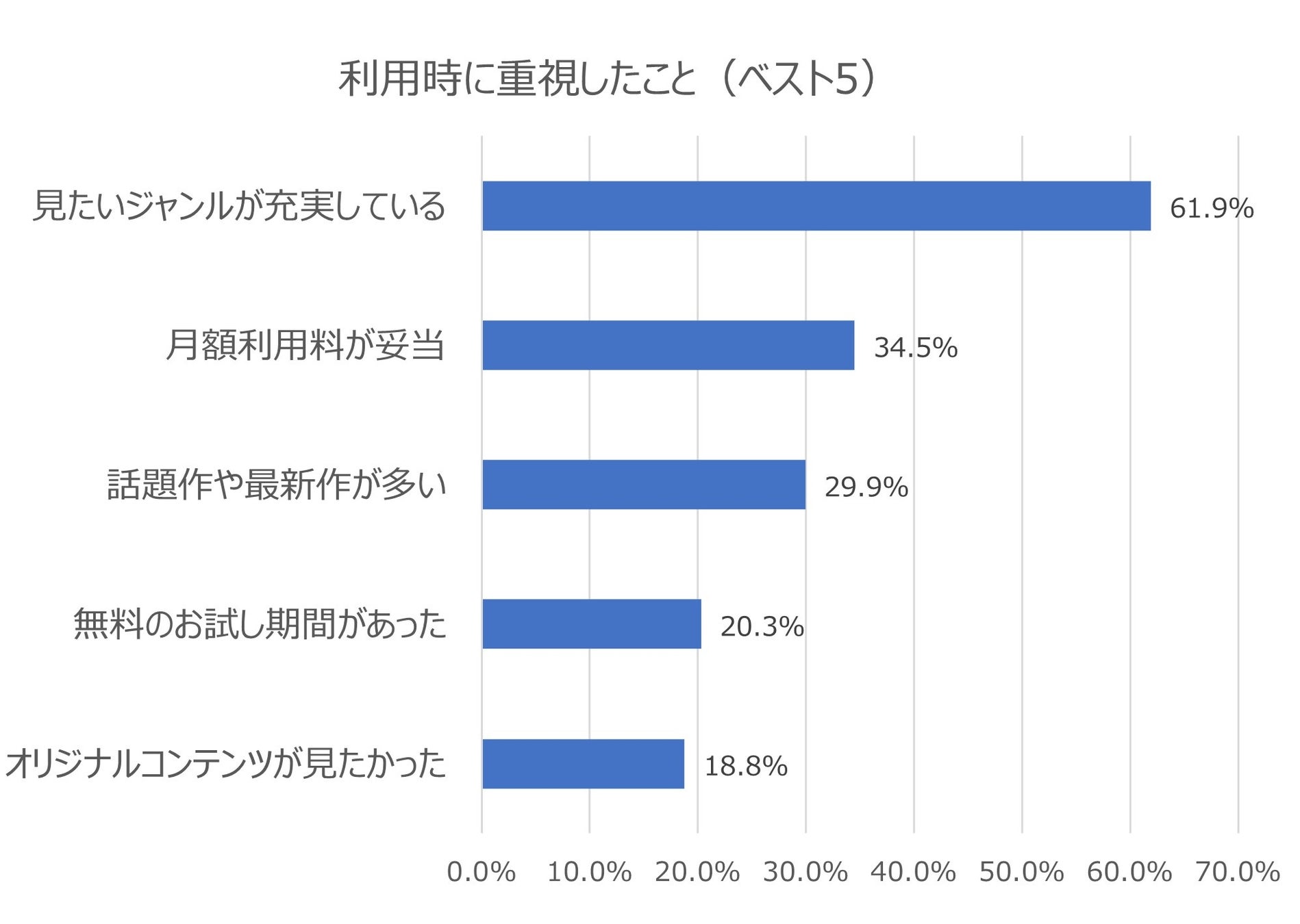 有料動画配信サービスの利用時に重視したことは「見たいジャンルが充実している」 が61.9%が1位に。次いで「月額利用料が妥当」、「話題作や最新作が多い」という結果に(複数回答)。