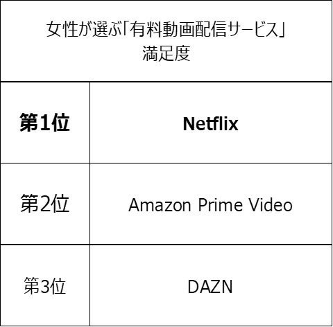 2022年9~11月に実施した調査において、「Amazon Prime Video」が女性が選ぶ「有料動画配信サービス」利用率第1位(同サービスはリピート率も第1位)、「Netflix」は満足度第1位(同サービスはオススメ率も第1位)を受賞しました。