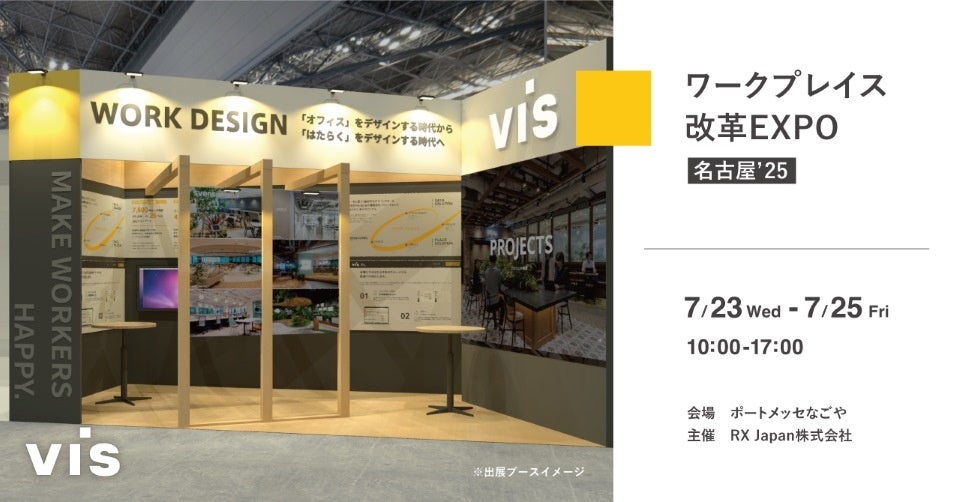『ワークデザイン』を手がける株式会社ヴィス(本社:東京都港区、代表取締役社長:金谷智浩)は、2025年7月23日~25日にポートメッセなごや(名古屋市)で開催される「ワークプレイス改革EXPO」に出展します。昨今、多様化する働き方やオフィス環境についてのご相談はもちろん、ワークプレイスの現状を可視化する『WORK DESIGN PLATFORM』のご紹介などを行います。