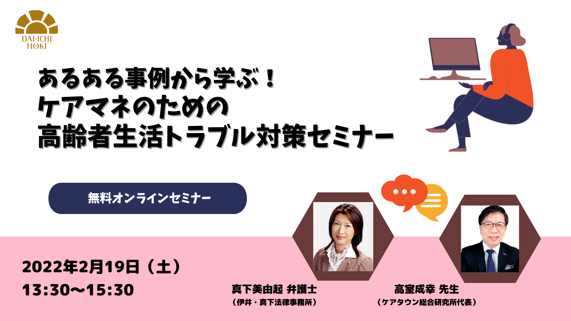 法律関連出版物、各種データベースを提供する第一法規株式会社(所在地:東京都港区、代表取締役社長:田中 英弥)は、『あるある事例から学ぶ!ケアマネのための高齢者生活トラブル対策セミナー』を、2022年2月19日に開催します。
