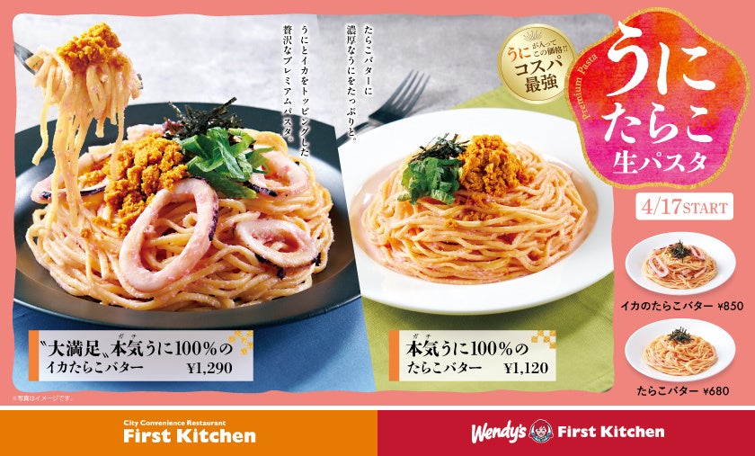 ウェンディーズ・ジャパン株式会社及び、ファーストキッチン株式会社 (所在地:東京都新宿区、代表取締役:紫関修) では、4月17日(木)から、ウェンディーズ・ファーストキッチンとファーストキッチン(※一部店舗を除く)にて、ミョウバン不使用で本来の旨味を味わえるうにやイカなど海の幸を使用した「“大満足”本気(ガチ)うに100%のイカたらこバター」など、4つの新商品を発売します。ファーストキッチンは本格的な生パスタを手軽に楽しめるハンバーガーチェーンで、2005年にパスタの販売をスタートしてから20年、女性のお客様を中心に親しまれてきました。今回の新商品は高級パスタの第2弾で、贅沢感のある濃厚なうにや、柔らかなイカなどをトッピングした華やかなパスタを、コスパ最強価格(1,290円)でご用意しました。また、シンプルな仕立てのたらこバターを日常使いにピッタリな価格帯(680円)でご提供します。