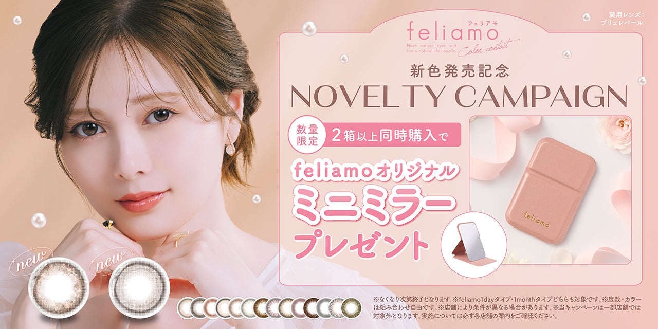 新色発売を記念し、『feliamo(フェリアモ)』のカラコンを2箱以上同時購入で、feliamoオリジナルミニミラーをプレゼントいたします。