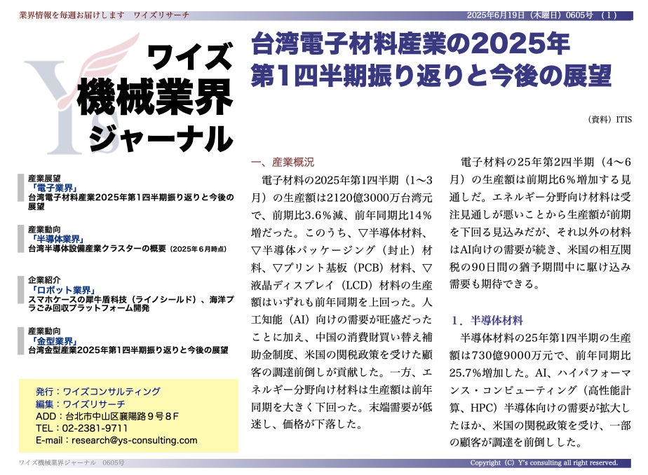 【台湾情報】台湾電子材料産業、AI特需で前年同期比14%増<ワイズ機械業界ジャーナル2025年6月第3週号発行>