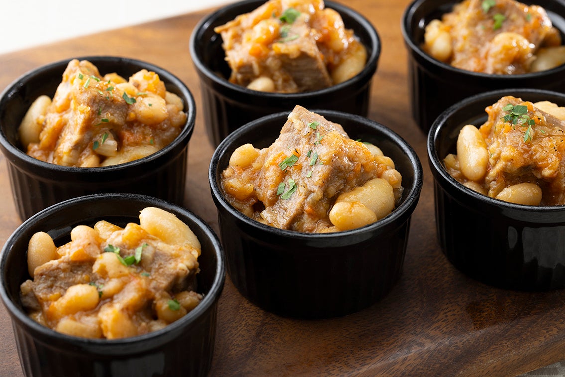 柔らかく煮込んだ牛肉と白インゲン豆のトマト煮込みは、トマトの程よい甘さと酸味を感じる逸品です。爽やかな柑橘の香りがアクセントに。