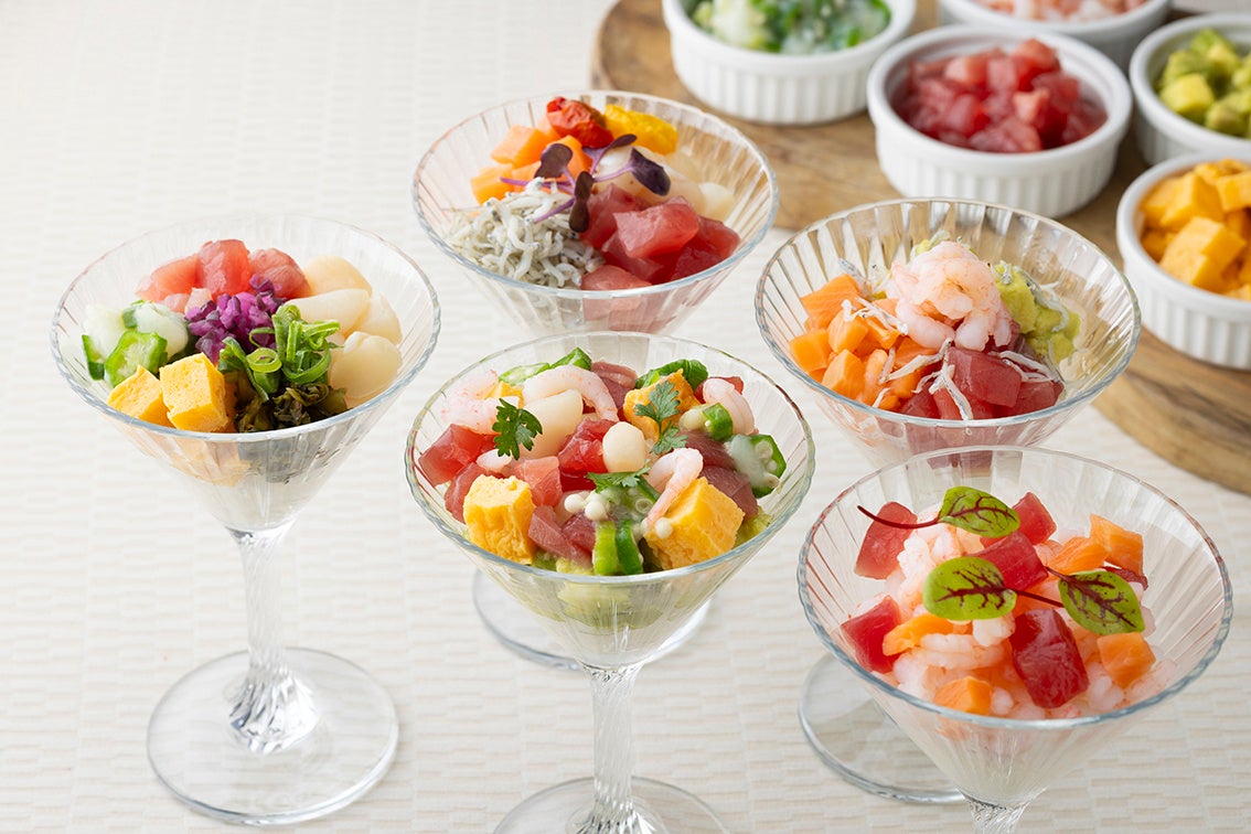 鮪や甘エビ、トラウトサーモン、アボカド、イカオクラなどをお好みでトッピング。オリジナルの海鮮パフェをお楽しみください。