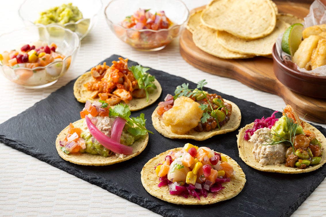 トルティーヤに肉や野菜、様々なコンディメントやソースを挟んで自由な味わいに。見た目も彩り鮮やかにアレンジできる食べ応えのある逸品です。