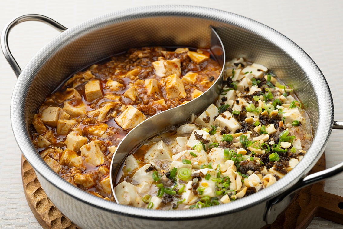 豚肉と豆腐を2種類の豆板醤と香り高い赤麻婆豆腐専用の辣油を加えて煮込んだ紅い麻婆豆腐と、牛肉と豆腐を塩味が効いた白湯で煮込み、山椒、一味唐辛子、搾菜、芽菜(ヤーツァイ)、カシューナッツ等を加えて仕上げた白い麻婆豆腐。食べ比べをお楽しみいただけます。
