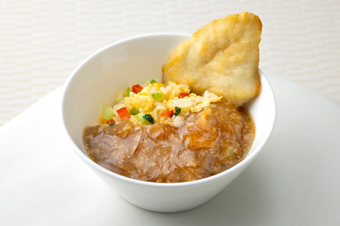 ・牛肝菌魚翅炒飯「気仙沼産フカヒレとピーチシャークを使ったポルチーニ茸香る餡かけチャーハン 」