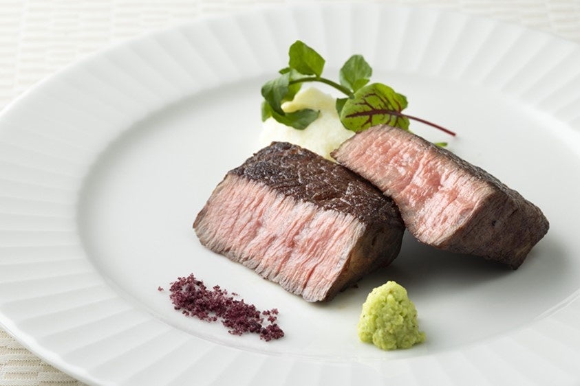 黒毛和牛のおいしさをそのままに、赤ワイン塩と山葵を添えた贅沢な一皿。