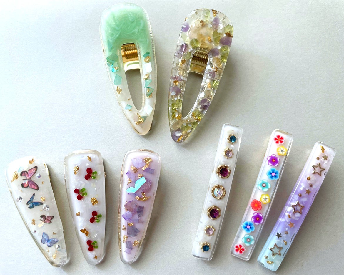 ヘアクリップが作れるレジン型に、お好みのパーツやシールを封入して、自分だけのオリジナルヘアクリップを作りましょう。