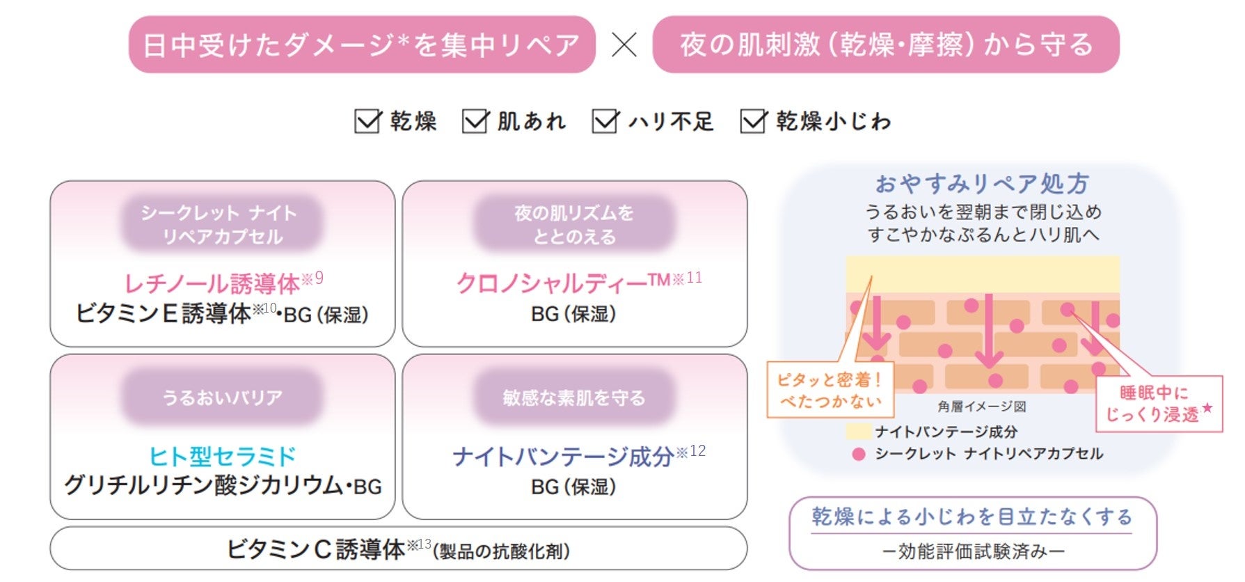 日中受けたダメージ*を集中ケアし、夜の肌刺激(乾燥・摩擦)から肌守ります。