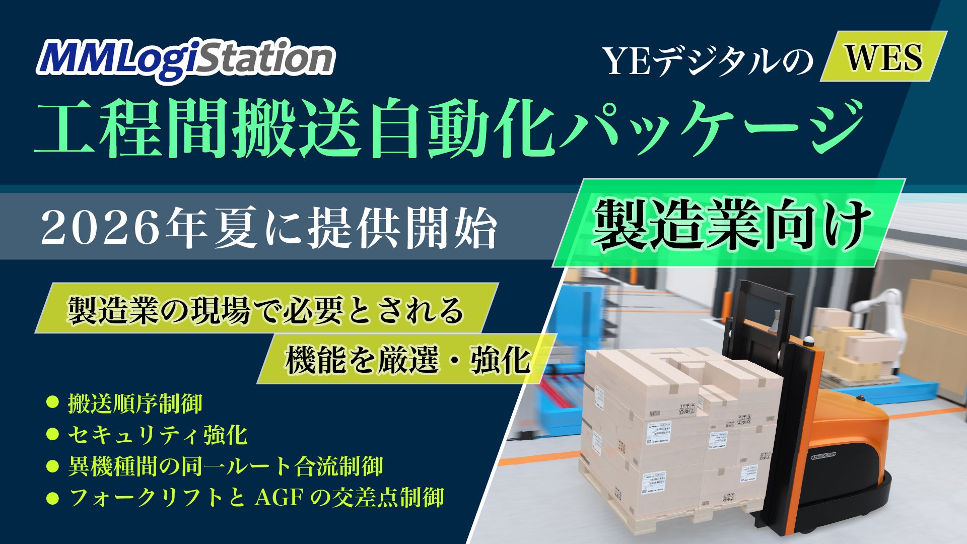 株式会社YE DIGITAL(本社:北九州市小倉北区、代表取締役社長:玉井裕治、以下 YEデジタル)は、倉庫自動化システム(WES)「MMLogiStation」より、製造業向け「工程間搬送自動化パッケージ」を、2026年夏に提供開始します。