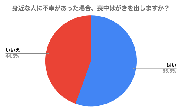 「今後、身近な人に不幸があった場合、喪中はがきを出しますか?」との問いに対し、「はい(今後も出す)」と答えた人が111人(55.5%)、「いいえ(今後は出さない)」と答えた人が89人(44.5%)となり、意見はほぼ二分されました。